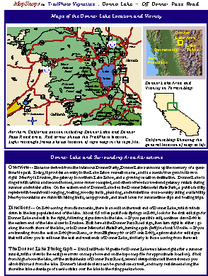 TrailPhoto Vignettes - Map Pages Samples The first two sets of digital TrailPhoto Vignettes are now available. The files include 2 natural areas each, in the vicinity of Lake Tahoe in northern California and in the eastern Sierra mountains. Samples of the Vignette maps and information pages are shown below. Each Vignette has the two map and information pages similar to the examples below, in addition to the photographs shown in reduced size on the main TrailPhoto Vignettes Photograph Samples page (opens in new browser window). These Vignette map page samples below are reduced in size both horizontally and vertically (and the sample text is not meant to be readable for display on this page) -- the actual files fill up an 8 1/2" x 11" sheet each when displayed or printed at full size. The example here is just meant to give an idea of the components of the full TrailPhoto Vignettes. Sample Area map file for Donner Lake TrailPhoto Vignette