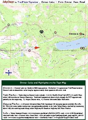 This example page above includes a map of California indicating the general location of the detailed map in its upper left corner. The detailed map has an arrow that marks the location of the photo for that Vignette. The map also highlights surrounding roads, cities, and natural features, and shows the location of the topo map displayed in the next sample page (below). The terrain map in the upper right hand corner of this example page gives a visual sense of the mountainous terrain in the vicinity of the TrailPhoto Vignette. The text below the maps provides other information about the area near the photo, and directions for getting there. Sample Topo map file for Donner Lake TrailPhoto Vignette