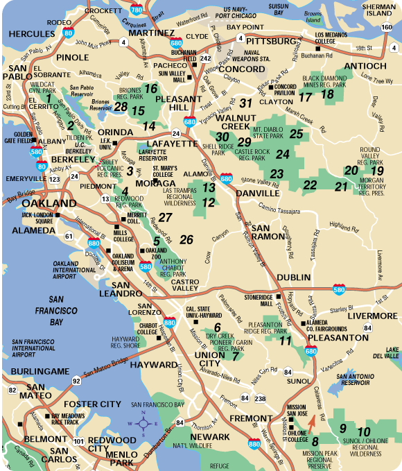 East Bay Region TrailPhoto Guides and TrailPhoto Scenes locations (Arrows on these maps show approximate location and viewing direction of the photo at the top of this page, in the East Bay Regional Park District). - East Bay Region TrailPhoto Guides and TrailPhoto Scenes Descriptions This TrailPhotos website has a thumbnail photo index and descriptions of thirty-one East Bay Region trails. Descriptions of these TrailPhoto Guides and TrailPhoto Scenes are available along with purchase information from this Photos: East Bay TrailPhoto Guide Trails link for the trails listed below. These include descriptions of fifteen of the EBRPD park areas, three EBMUD areas, Mt. Diablo State Park, and two open space areas maintained by city departments. This does not encompass all the main parks of the East Bay, but does cover several areas that have major trail mileage. The East Bay Regional Park District (EBRPD) is the primary open space agency in this area, though Mt. Diablo State Park is the single most dominant park. There are other trails as well, in the watershed lands of the East Bay Municipal Utility District (EBMUD), Shell Ridge open space in Walnut Creek, and Lime Ridge open space in Walnut Creek and Concord. Miles of open country and forest covered trails await the adventurous. These lands are open to all, and most can be visited free of charge. There is a small entrance fee at Mt. Diablo State Park parking areas, and the EBMUD lands require that a trail permit be obtained ahead of time, also for a minor fee. A few of the EBRPD lands have parking fees, though many trailheads do not. East Bay Region open space descriptions and external links to the parks and trails covered in the East Bay TrailPhoto Guides and TrailPhoto Scenes are shown below, matched to the the corresponding numbers on map above: Note: Park links underlined below connect to information about them at external websites, in a new browser window. East Bay Regional Park District Area IN ALAMEDA COUNTY : Wildcat Canyon Park Dry Creek Pioneer / Garin Parks 1) Boas - San Pablo Ridge Trail 6) High Ridge Trail Tilden Park 7) Vista Peak Loop Trail 2) Quarry - Seaview Trail Mission Peak Preserve Sibley Volcanic Preserve 8) Hidden Valley - Eagle Trail 3) Round Top Loop - Volcanic Trail Sunol / Ohlone Wilderness Roberts / Redwood Park 9) Indian Joe - Grande Vista Trail 4) Graham - West Ridge Trail 10) McCorkle Trail Anthony Chabot Park Pleasanton Ridge Park 5) Grass Valley - Goldenrod Trail 11) Thermalito - Ridgeline Trail _ IN CONTRA COSTA COUNTY : Las Trampas / Little Hills Wilderness Black Diamond Mines Preserve 12) Elderberry - Upper Ridge Trail 17) Clayton - Black Diamond Trail 13) Las Trampas Ridge Trail 18) Stewartville - Ridge Trail Briones Park Round Valley Preserve 14) Lafayette Ridge Trail 19) Miwok Trail 15) Briones Crest Trail Morgan Territory Preserve 16) Old Briones Road Trail 20) Blue Oak - Valley View Trail Castle Rock /Diablo Foothills Park 21) Highland Ridge Trail See Trail # 29 - Also joins with Shell Ridge Park _ Mt. Diablo State Park Area (In Contra Costa County) 22) Finley Road Trail 24) Black Hawk Ridge Trail 23) BBQ Terrace Road 25) Diablo Falls Trail _ East Bay Municipal Utility District Area (In Alameda and Contra Costa Counties) 26) Ramage Peak Trail 28) Briones Reservoir Trail 27) San Leandro Reservoir Trail _ Other East Bay Park Areas (In Contra Costa County) 29) Costanoan Trail 30) Kovar - Ridge Top Trail 31) Quarry Trail TrailPhoto Guides and TrailPhoto Scenes for this Region: Photos: East Bay TrailPhoto Guide Trails Some great external links for exploring East Bay natural areas and trails: Bay Nature The premier website & magazine for San Francisco Bay Area natural areas Transit & Trails A great website allowing you to plan your trips to Bay Area trails via public transit Home | What's New | FAQ | User Notes | About Us/Contact © 2000-2010 MapSnaps All rights reserved |