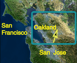 Rumpled, golden green hills roll to infinity at Mission Peak Regional Preserve The East Bay Region of the San Francisco Bay Area contains many parks, reservoirs, and wilderness expanses with hundreds of miles of trails. East Bay open spaces are blanketed with heavier woods and cooler climes in the west side hills just above Berkeley and Oakland down through Fremont. Open expanses of rolling hills and oak trees dominate the terrain east of the Berkeley/Oakland hills. Location The East Bay Region of the TrailPhoto Guides and TrailPhoto Scenes extends throughout the entire counties of Alameda and Contra Costa, to the east of San Francisco. The maps shown below indicate the general location of trails covered in this section of TrailPhotos. Each of the highlighted park districts and other park areas shown on the detailed map that follows have links to further information on websites provided by their land management organizations.