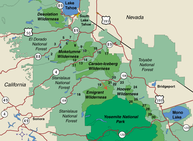 Peaks above Kennedy Meadows' en route to Relief Reservoir, off CA Highway 108 The region stretching south from Highway 88 to the border of the northern reaches of Yosemite National Park in the Sierra Nevada mountains offers a full menu from leisurely Sunday strolls to wicked climbs in the steep but spectacular eastern Sierra. Trails branching off from State Highways 88 and 4 offer the visitor a transition zone of wooded paths and wildflower covered ridges, with a selection of alpine lakes awaiting a cool summer plunge. Included here are the Mokelumne Wilderness, the Carson-Iceberg Wilderness, and the Emigrant Wilderness. Heading further south towards Yosemite, some of the most stunning peaks and meadows covered on this website are located between the town of Bridgeport and Mono Lake in the eastern reaches of the Sierra off U.S. Highway 395 and the Hoover Wilderness. While generally not as well known as the Lake Tahoe Basin to the north, this region frequently offers less crowded getaways and trail excursions for the adventurous. Location The mountains from Highway 88 to the northern part of Yosemite National Park can be reached from the California Central Valley via a number of entry points. California Highways 88, 4, and 108 cross the range into the eastern Sierra and on to Nevada. Highway 120 bisects Yosemite from east to west, though the trails currently covered on this website are all located to the north of 120. US Highway 395 stretches north-south on the eastern side of the Sierra crest, connecting these other routes that cross the range from East to West. The maps shown immediately below indicate the general location of trails covered in this section of the TrailPhoto Guides and TrailPhoto Scenes. Each of these highway route areas links to a separate page on this website, with a more in-depth description of the area and its trails on those pages. The yellow arrow on the Terrain Map above shows the approximate location and viewing direction of the photo displayed near the top of this web page. The olive rectangle on the terrain map outlines the approx. coverage area for the Highway 88 to north of Yosemite Region TrailPhoto Guides and TrailPhoto Scenes. - Highway 88 to north of Yosemite TrailPhoto Guides and TrailPhoto Scenes locations (Red arrow shows approximate location and direction of the photo at the top of this page for the Highway 88 to north of Yosemite Region). - Highway 88 to north Yosemite Region TrailPhoto Guides and TrailPhoto Scenes Descriptions This TrailPhotos.com website has a thumbnail photo index and descriptions of thirty trails in the Highway 88 to north Yosemite National Park border region. Descriptions of these TrailPhoto Guides and TrailPhoto Scenes are available along with purchase information from this Photos: Highway 88 to N. Yosemite TrailPhoto Guide Trails link, for the trails listed below. This Region's TrailPhoto Guides and TrailPhoto Scenes are broken out into four sections along each of the following highway corridors. More information is available for each area listed below by clicking on the section name. The approximate location of these trails is shown on the detailed area map above, matched to the corresponding numbers displayed below: 1) Tanglefoot Trail to Shiner Lake 6) Caples Lake to Emigrant Lake 2) Devil's Lake 7) PCT North to Showers Lake 3) Shealor Lake 8) Roundtop to 4th of July Lake 4) Hidden Lake Loop 9) Charity Valley West 5) Lake Margaret 10) PCT North from Blue Lakes _ 11) Alpine Lake / Elephant Rock Lake 15) PCT North to Raymond Valley 12) Woodchuck Country 16) PCT South to Nobel Canyon 13) Mosquito Lake to Bull Run Lake 17) High Trail 14) Pacific Valley to Bull Run Peak _ 18) Dodge Ridge to Bear Lake 21) PCT South to Leavitt Lake 19) Relief Reservoir Trail 22) Sardine Falls Trail 20) PCT North to Wolf Creek Lake 23) Leavitt Meadows Trail _ 24) Buckeye Creek 28) Virginia Lakes 25) Twin Lakes to Barney Lake 29) Lundy Canyon Trail 26) Barney Lake to Kerrick Meadow 30) Oneida Lake 27) Green Creek to West Lake TrailPhoto Guides and TrailPhoto Scenes for this Region: Photos: Highway 88 to north of Yosemite TrailPhoto Guide Trails Related Links The National Forest Service maintains websites with extensive information and park maps. These provide an official and useful complement to the detailed TrailPhoto Guides and maps on this website. The applicable National Forests for the Highway 88 to North Yosemite National Park Area are (these links will open in a new browser window): Eldorado National Forest - Located around the Highway 88 area. Stanislaus National Forest - Located around the Highway 4 and Highway 108 areas. Toiyabe National Forest - Located around the Highway 108 and Highway 395 areas. Other sources of information for this area (these links open in a new browser window): Yosemite National Park Information - Related to trails in the Highway 395 area. State of California Visitors Information - Includes general info for these areas off Hwy. 88 / Yosemite. Home | What's New | FAQ | User Notes | About Us/Contact © 2000-2010 MapSnaps All rights reserved |
