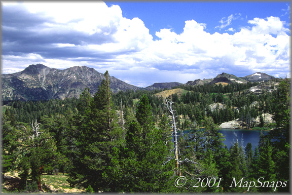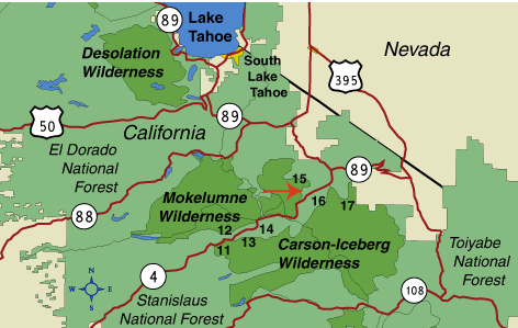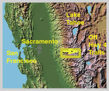 View from the trail to the east over Upper Kinney Lake California State Highway 4 seems like just another route over the Sierra, until you reach the upper ranges, arriving from the west. Above Alpine Lake, a blue gem just above the meadows of Bear Valley, the high country of lakes and trails unfolds. In its uppermost reaches, Highway 4 becomes a wide one lane road for several miles, not suitable for hauling trailers or large vehicles. Here, traffic seems lighter and less encumbered. But the scenery and vistas are invigorating along the crest, and across the eastern side of the pass the terrain opens further, with fewer trees and many high rocky peaks. TrailPhoto Guides and TrailPhoto Scenes in this section straddle the ridges of the Pacific Crest Trail, on the Trail itself and to the east and west. Here are lake-dotted forests, steep canyon walls and peaks, and green meadows lush with wildflowers and creeks. Farther to the east, the High Trail reveals the character of the semi-arid mountain lands, with its sagebrush, boulder strewn hillsides, and ponderosa pines. In the Highway 4 area, the TrailPhotos cover terrain in the Stanislaus and Toiyabe National Forests, and reach into the Carson-Iceberg and Mokelumne Wilderness Areas. The Pacific Crest Trail routes going both north and south from Highway 4 in these TrailPhoto Guides and TrailPhoto Scenes include among the more varied and dramatic of the trails, running along the crest of the western Sierra. While the other trails in this area are not dominated by the PCT ridge crest, they do offer an interesting variety among the forests and lakes that typify this region. Location The trails along Highway 4 are generally right off the highway, except for a few that are reached over gravel roads on turnoff roads from Highway 4. The only one of these requiring more than a short detour from the main road is the High Trail, which requires a several mile access from the eastern reaches of Highway 4 down into Wolf Meadow. The maps below give an overview of these trails' general location. Off Highway 4 TrailPhotos Area California Location of Terrain Map The yellow arrow on the Terrain Map above shows the approximate location and viewing direction of the photograph displayed near the top of this web page. The olive colored rectangle on the terrain map outlines the general coverage area for the Off Highway 4 TrailPhotos.