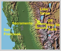 Caples Lake looking southeast from the trail's edge California State Highway 88 is one of the closest routes into the Sierra Nevada mountains from the San Francisco Bay Area. The trails in this section typically start at locations a short distance off Highway 88, and most are day trips that end at or pass by little sparkling lakes. Although Highway 88 trails reach into the rugged Mokelumne Wilderness, most of the TrailPhoto Guides and TrailPhoto Scenes included for this region are less strenuous than those to the north and south of this area. The scenery, however, can be striking as you are treated to wide open meadows and plateaus surrounded by towering eroded cliffs and mountain peaks. In this regard, it is similar to the nearby South of Lake Tahoe area in this website. Highway 88 bisects the Sierra Nevada at Carson Pass, where the Pacific Crest Trail crosses to the north and south. The elevation near this pass is around 8,000 feet, which can bring cooler weather and earlier snow in the winter to this area than to the passes around Lake Tahoe to the north. Yet the Highway 88 area can also easily be reached from the Tahoe area using the connecting Highway 89 from the north. Route 88 is somewhat less commercialized than Highways 50 and I-80 that lead into Lake Tahoe. One of the main attractions along Highway 88 is the Kirkwood ski area and resort, which has lodging, food and gas, and is a summer resort as well. Silver Lake and Caples Lake are a big attraction for campers, boaters, and hikers, and Kirkwood resort is located along the road in between these lakes. Location Many of the trails in the Highway 88 corridor can be accessed just off the highway, although a few require short trips along spur roads off the highway. There are also a few trails starting from the Blue Lakes area that require a longer side trip from Highway 88, but it is well worth the drive as it passes through the large, magnificent Hope Valley meadows along the Blue Lakes Road. The maps below give an overview of these trails' general location. Off Highway 88 TrailPhotos Area California Location of Terrain Map The yellow arrow on the Terrain Map above shows the approximate location and viewing direction of the photograph displayed near the top of this web page. The olive colored rectangle on the terrain map outlines the general coverage area for the Off Highway 88 TrailPhotos.