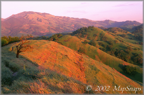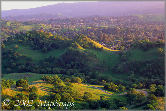 Late afternoon sun dapples the valley below Shell Ridge, tucked in near suburbia . To preview or acquire this TrailPhoto Guide, complete with all the color photos and their mapped locations, area and topo maps, directions, and the trail guide text, please visit Scribd.com. (This TrailPhoto Guide is now available at the Scribd website to preview, or acquire for $1.50). Or, view a free, complete TrailPhoto Guide Sample at Scribd.com first. This sample includes a TrailPhoto Guide to the Eagle Lake Trail in the Lake Tahoe Region (Other TrailPhoto Guides are also available with free preview pages and for purchase from MapSnaps at Scribd.com).