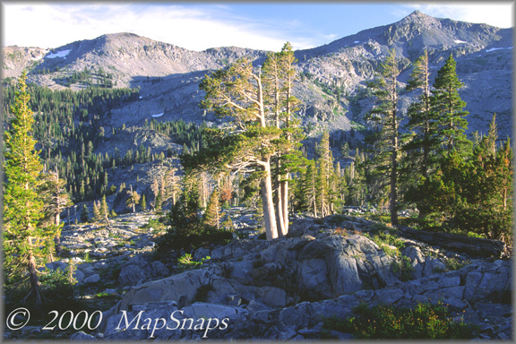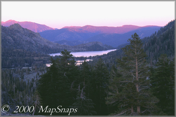 The area around Desolation Wilderness is filled with rocky shields and peaks . . Echo Lakes beneath purple mountains at day's end, from Desolation Wilderness - To preview or acquire this TrailPhoto Guide, complete with all the color photos and their mapped locations, area and topo maps, directions, and the trail guide text, please visit Scribd.com. (This TrailPhoto Guide is now available at the Scribd website to preview, or acquire it for $1.50). Or, view a free, complete TrailPhoto Guide sample at Scribd.com. This sample includes a TrailPhoto Guide to the Eagle Lake trail in the Lake Tahloe Region (Other TrailPhoto Guides are also available with free preview pages and for purchase from MapSnaps at Scribd.com).