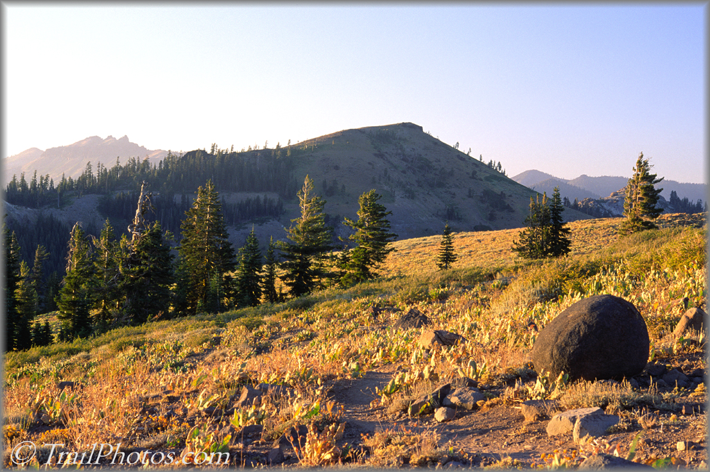 Tahoe TrailPhoto Gallery - PCT South from I-80 The Pacific Crest Trail morphs into a field of gold with sunset coming, south of I-80 Tahoe National Forest (Also see this photo at: Flickr) * Pacific Crest Trail South from I-80 in North of Lake Tahoe Area. * Difficulty = Moderate. Scenic value = 9 / 10. * This TrailPhoto Guide is under development. Please check back again for updates.