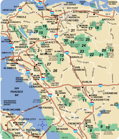 Welcome to the colorful world of TrailPhotos. This is the starting point for exploring the individual TrailPhotos in the East Bay Region of northern California. Below are thumbnail photos for each of the East Bay Region TrailPhoto Guides and TrailPhoto Scenes. Map numbers show trail locations.